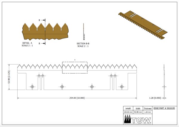 BAG KNIFE 75°, TiN COATED, GLOUCESTER #27T WS, 10" L x 1.125" W x .053" TH , 254mm L x 54mm W x 1.3mm TH
